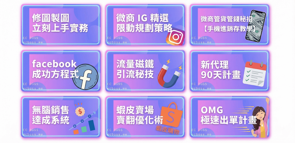 我是第一次接觸行動加盟就遇到 EC Boss 的幸運兒!由零開始的個人定位,到製圖銷售及社交媒體引流技巧,都可以一步一步跟著系統學習! 最重要的是我可以隨時隨地 ,有空就可以學習👍 這樣的課程在外面都不知道要花多少錢了!! 真感恩我遇到這麼好的團隊❤️